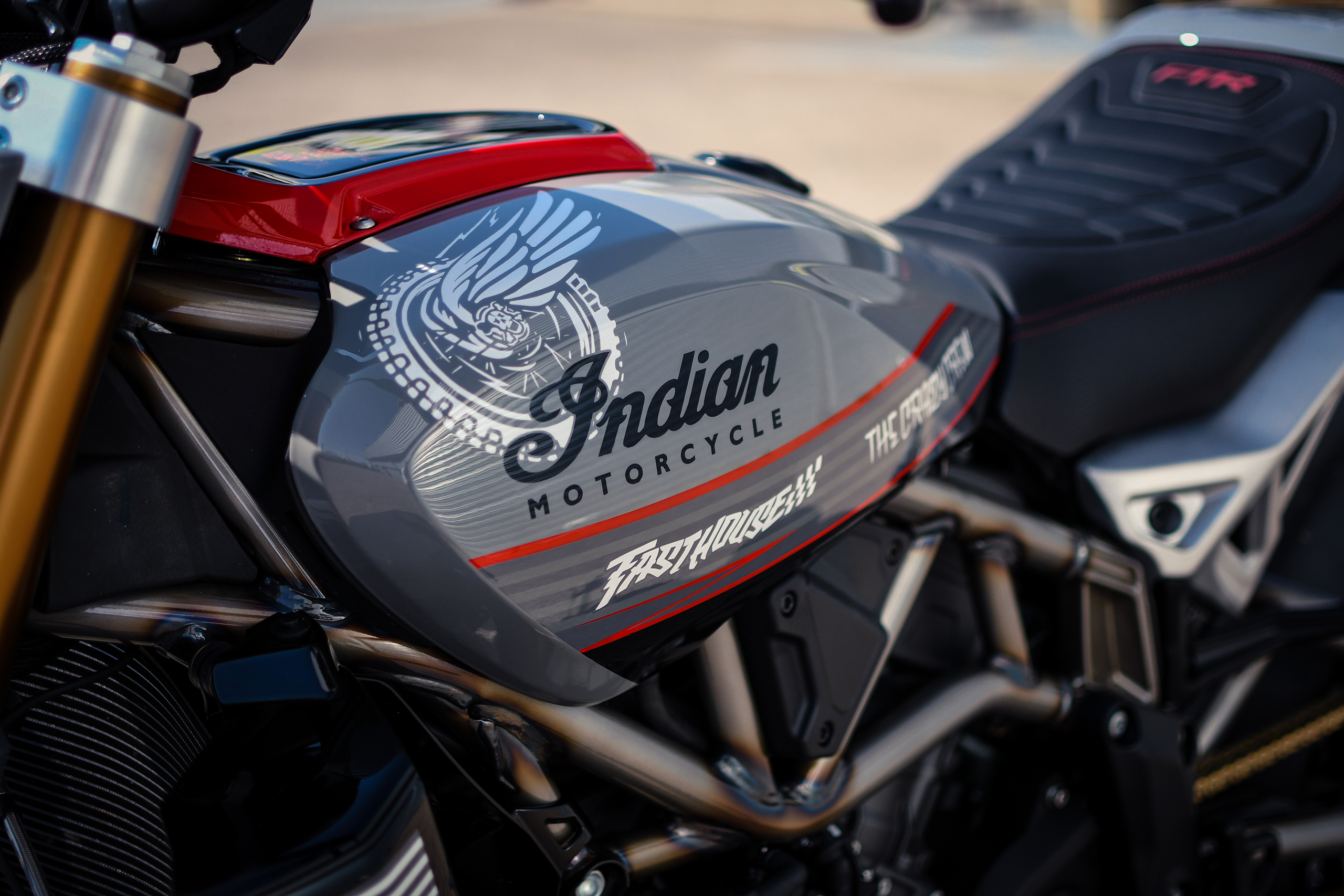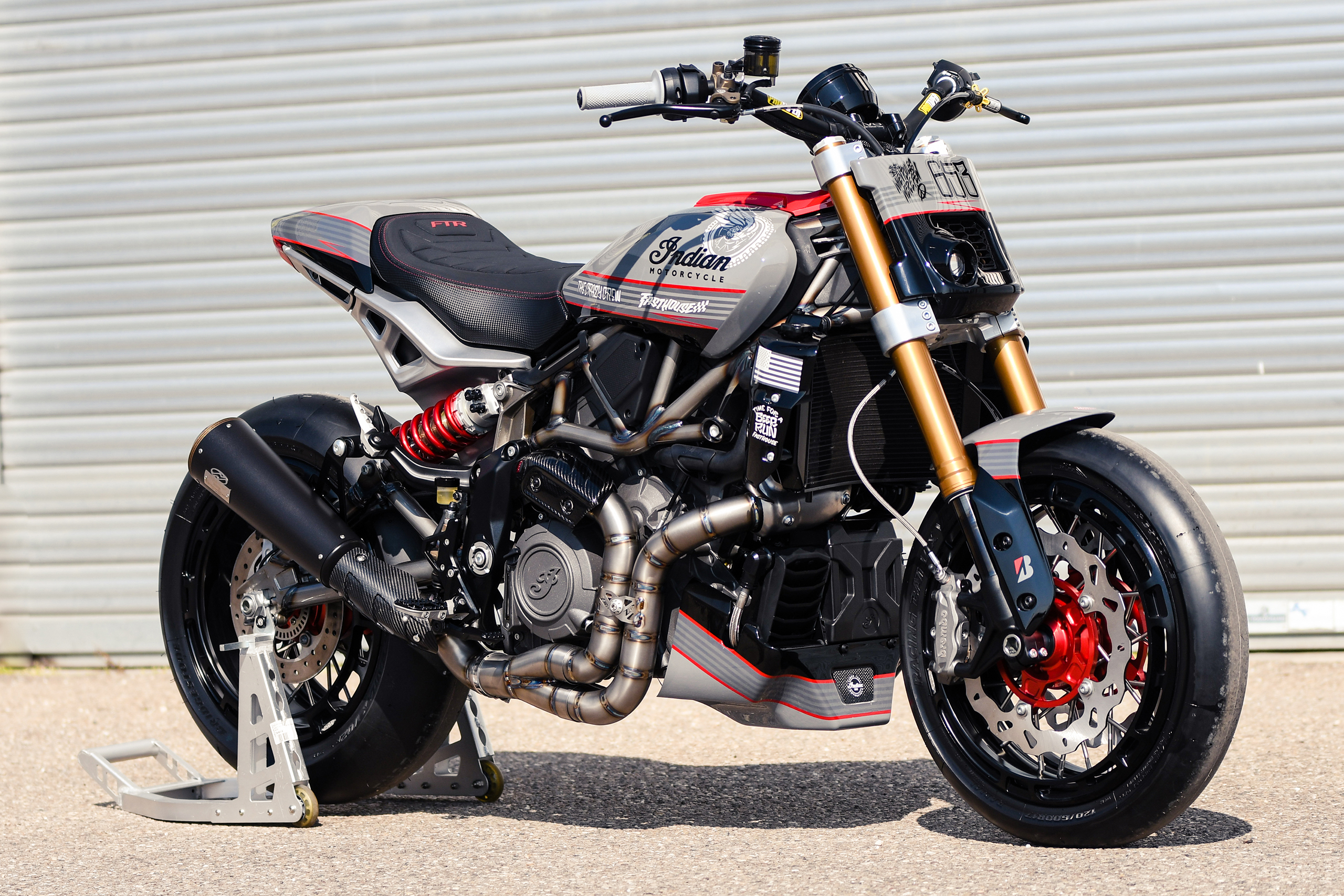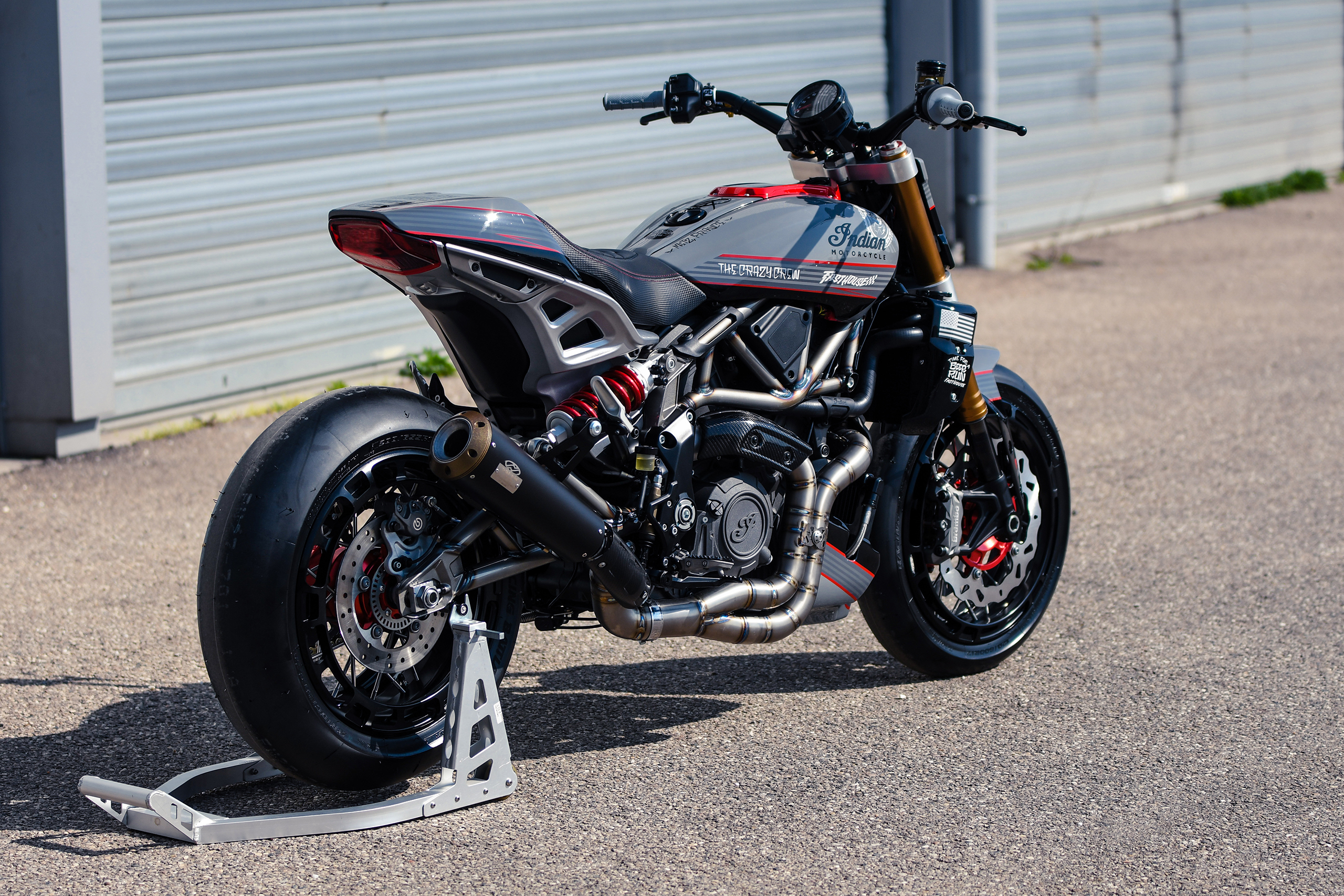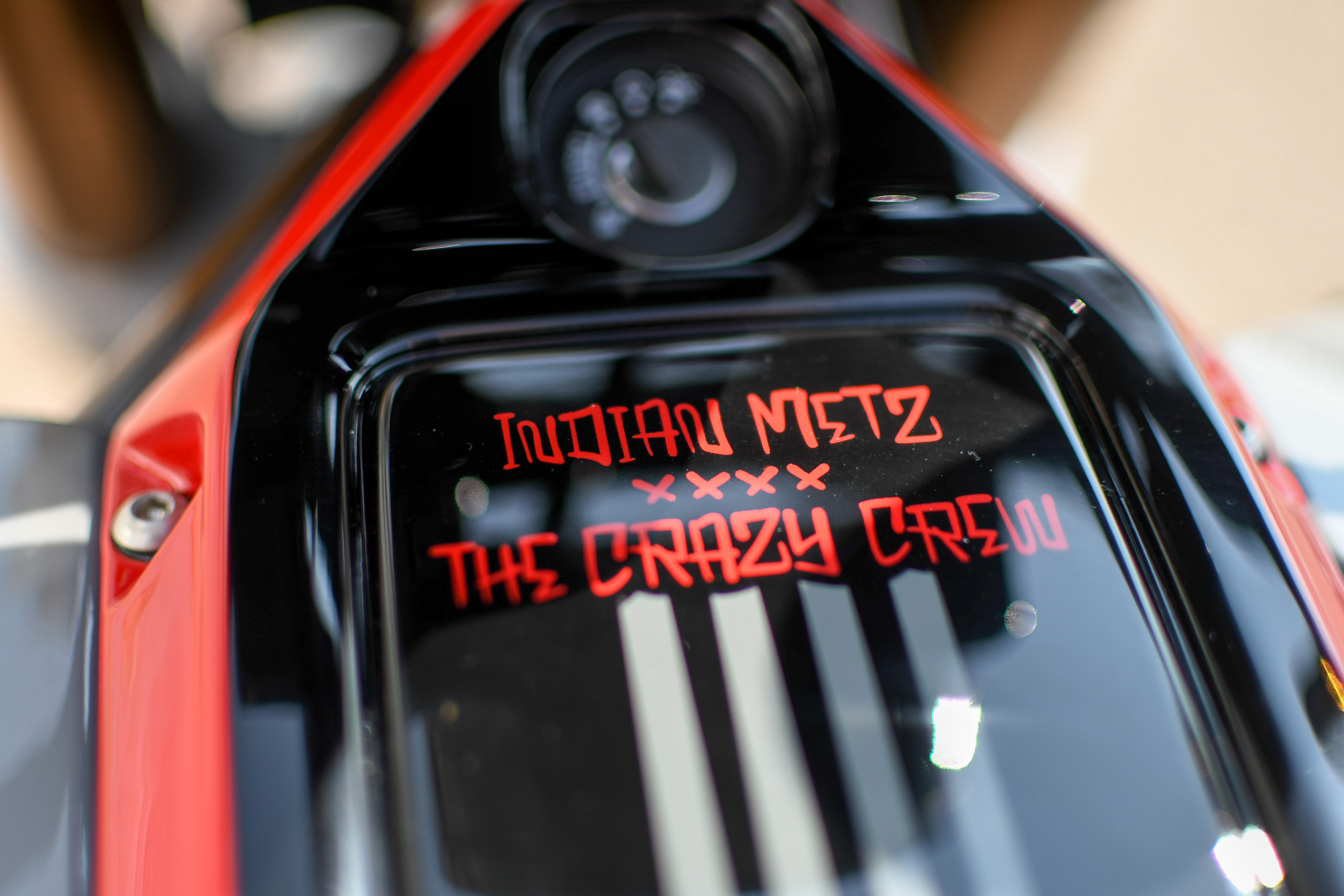 Après avoir construit une foule de customs basées sur la plate-forme, Thomas Castany et Alexis Masin d’Indian Metz ont décidé qu’ils voulaient quelque chose d’amusant et de ludique, et se sont inspirés du monde du motocross freestyle. Bien sûr, ils n’étaient pas intéressés par les backflips ou les whips, l’idée était de créer quelque chose qui prenait le plaisir du FMX et le traduisait sur la route. Combinant avec leurs amis de L’Atelier 216 et des sponsors tels que Fasthouse, les travaux ont rapidement commencé. J’ai eu l’immense chance de shooter la bête !